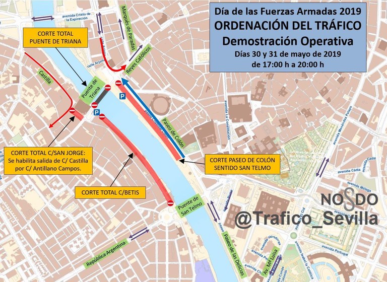 Corte de tráfico en Paseo de Colón (1 de junio) 29/05/2019 11:53 CONSULTA LA FASE 1 CONSULTA LA FASE 2 Servicio de TUSSAM Cortes de tráfico previstos para el 1 de junio, por la celebración del Día de las Fuerzas Armadas, a partir de las 7:30 horas. Cortes 30 y 31 de mayo Galería de Imágenes Acciones de documento Imprimir Enviar Compartir Compartir en facebook Compartir en twitter Compartir en linkedin Compartir en whatsapp