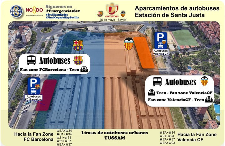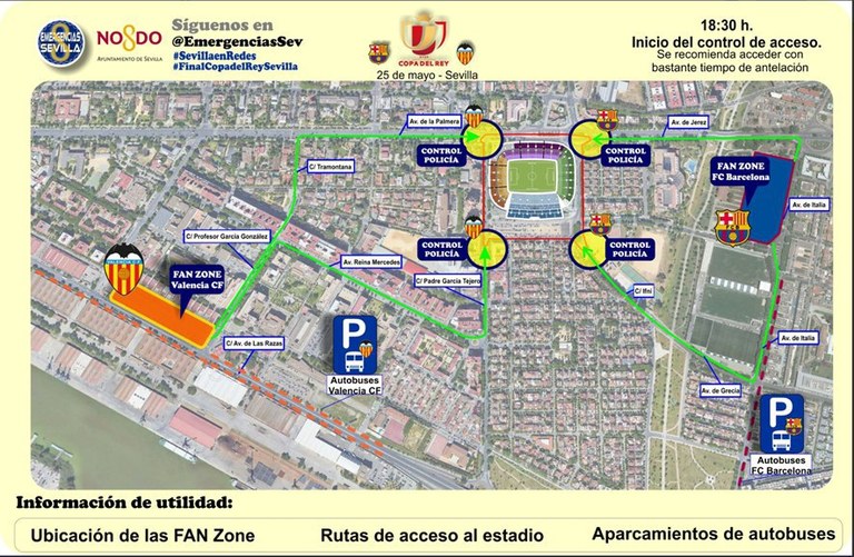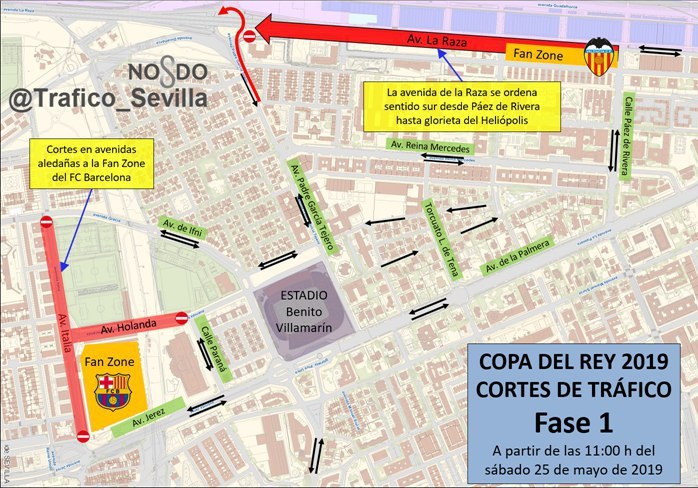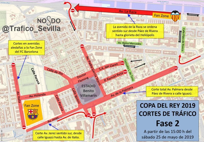 Respecto al plan especial de tráfico previsto por el Área de Movilidad del Ayuntamiento de Sevilla, cabe destacar que las restricciones comenzarán el sábado 25 de mayo a las 11.00 horas, con cortes en las vías aledañas a las ‘Fan Zone’ de cada equipo, que se ubican en la Avenida de Italia en confluencia con la de Holanda; en el caso del Barcelona y en la Avenida de Las Razas en el caso del Valencia, Estas zonas estarán abiertas desde las 10.00 hasta las 18.00 horas del sábado. Así, desde las 11.00 quedarán completamente cortadas al tráfico la Avenida de Italia y la de Holanda, mientras que en la Avenida de Las Razas solo se permitirá la circulación en sentido sur desde Páez de Rivera hasta la Glorieta de Heliópolis. A partir de las 15.00 horas a estas restricciones se suman los cortes al tráfico en el entorno del Estadio Benito Villamarín. La Avenida de la Palmera quedará completamente cortada al tráfico en el tramo comprendido entre las calles Paez de Rivera e Iguazú, mientras que la Avenida de Jerez quedará cortada en sentido sur, en el tramo comprendido entre la calle Iguazú y la Avenida de Italia. Del mismo modo, se llevarán a cabo cortes totales al tráfico en todas las vías aledañas al estadio como las calles San Antonio María Claret, Padre García Tejero, Periodista Ramón Resa, Ifni, Iguazú y Paraná.