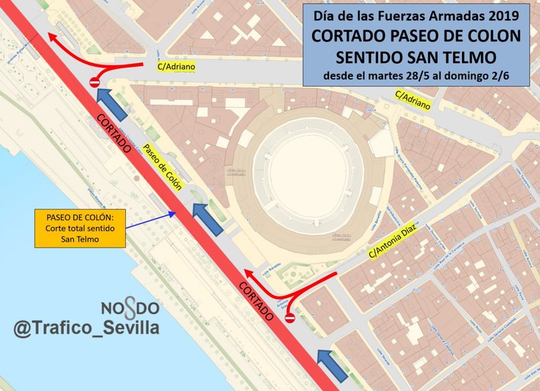 La circulación rodada por el Paseo de Cristóbal Colón en sentido Sur –esto es, hacia el Palacio de San Telmo-Avenida de la Palmera– quedará desde mañana afectada por los preparativos de los actos del Día de las Fuerzas Armadas, cuya jornada principal se celebrará el día 1 de junio, sábado. Las áreas de Movilidad y Seguridad del Ayuntamiento de Sevilla, a través del CECOP, en coordinación con los Cuerpos y Fuerzas de Seguridad del Estado, procederán al corte total de los dos carriles en sentido San Telmo para así atender las necesidades de los trabajos de montaje del escenario previsto y a las propias medidas de seguridad para este evento, con rutas alternativas para los conductores.