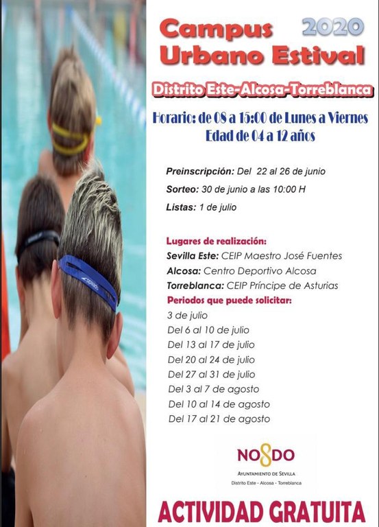 El Ayuntamiento de Sevilla abre este lunes la convocatoria del Campus Urbano Estival del Distrito Este-Alcosa-Torreblanca, que se desarrollará en tres sedes diferentes, una por cada barrio. Esta actividad, paralela a la de otros distritos y delegaciones, es de carácter gratuito en el contexto actual marcado por la pandemia de la COVID-19.