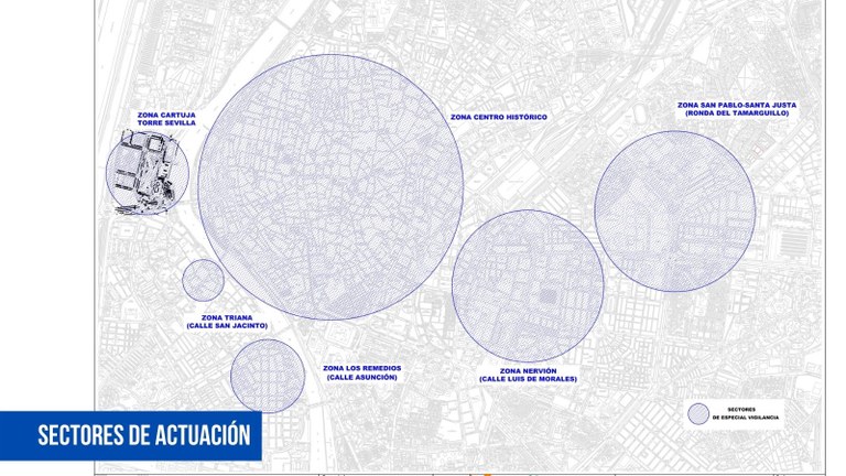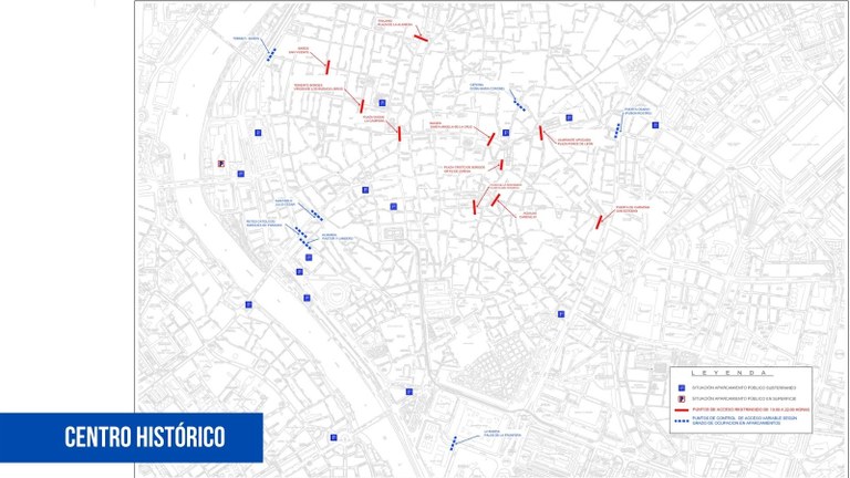 Los accesos al Centro serán controlados por la Policía Local en 14 enclaves: Reyes Católicos con Marqués de Paradas, San Pablo (a la altura de la calle Julio César); San Vicente con Baños-Baños y con Torneo; Teniente Borges con Virgen de los Buenos Libros; Plaza de la Alameda con Trajano; Puerta Osario (Puñonrostro); Almirante Apodaca con Plaza Ponce de León; Gerona con Doña María Coronel; Imagen con Sor Ángela de la Cruz-Imagen con Doña María Coronel; Plaza de San Pedro con Ortiz de Zúñiga; Puerta de Carmona (en San Esteban); Águilas con Candilejo; Plaza de la Pescadería con la Cuesta del Rosario, y Campana. Estos puntos de control serán asimismo de horario flexible en función de las autorizaciones de apertura de los establecimientos que apruebe en cada momento la Junta de Andalucía.