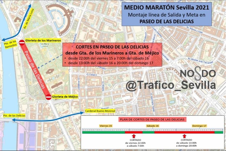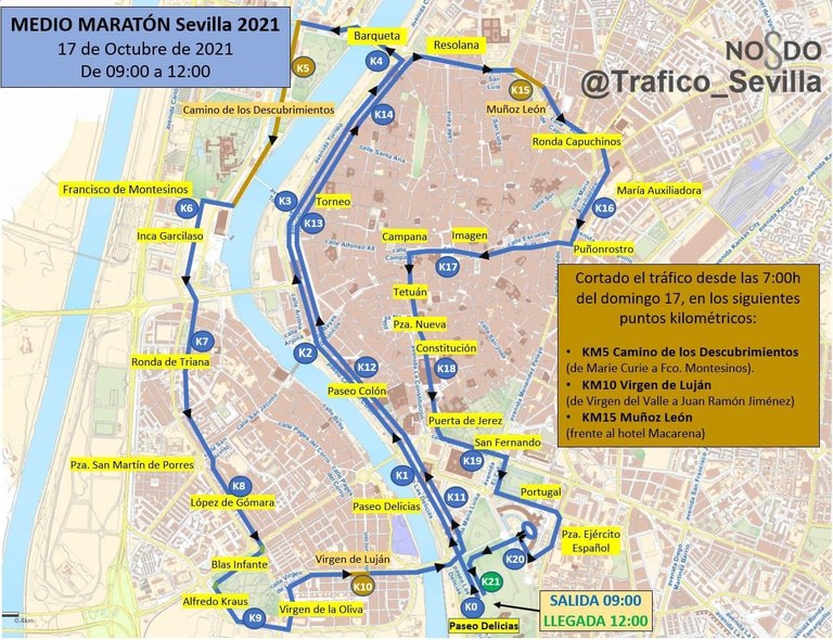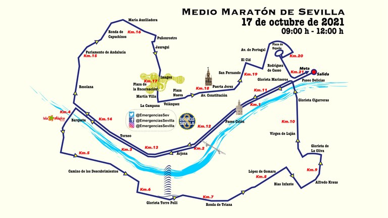 Este circuito mantiene salida y meta en la glorieta de Buenos Aires, en el paseo de Las Delicias. Se desarrolla sobre un terreno absolutamente plano que conduce a los participantes por el centro de la ciudad y por muchas de las céntricas calles del casco histórico, destacando el paso por la Torre del Oro, la Maestranza, Torneo, la Ronda Histórica, las Setas de la Encarnación, la Campana o la calle Tetuán, la Plaza Nueva y el Ayuntamiento, la avenida de la Constitución, la Catedral, parque de María Luisa y Plaza de España, entre otros muchos lugares icónicos.