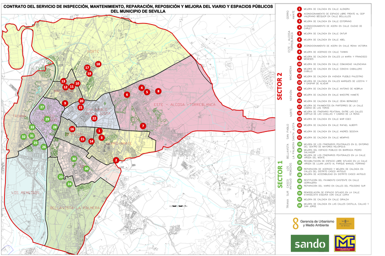 El Ayuntamiento de Sevilla, a través de la Gerencia de Urbanismo y Medio Ambiente, en coordinación con los distritos municipales, ha iniciado un plan especial con 33 proyectos de mejoras de calzadas, acerados y espacios públicos en todos los distritos con un presupuesto de un millón de euros. Se trata de un programa que se enmarca dentro del nuevo contrato de conservación y mantenimiento de los espacios y viario de la ciudad que ha incrementado en un 150% los recursos económicos asignados y ha triplicado la capacidad de actuación.