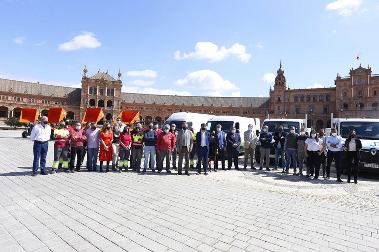 El alcalde de Sevilla, Juan Espadas, junto al delegado de Transición Ecológica, David Guevara, acompañados de representantes sindicales y de la plantilla han presentado esta nueva flota que tiene como objetivo renovar todos los vehículos con más de diez años existentes, aumentar la flota con un mayor alcance y efectividad, incorporar bicicletas y motos eléctricas y garantizar mediante un sistema de renting un mejor mantenimiento de los vehículos. Concretamente, se han adquirido 7 turismos, 7 furgones de distinto tamaño, 3 camiones ligeros, un pick up, seis bicicletas eléctricas, dos motocicletas eléctricas y 8 vehículos volquete autopropulsados.