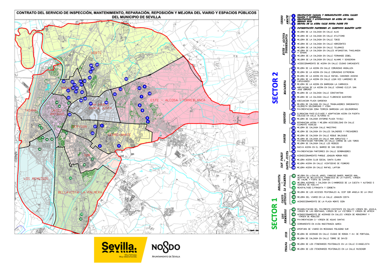 El Ayuntamiento de Sevilla, a través de la Gerencia de Urbanismo y Medio Ambiente en coordinación con los once distritos municipales, tiene en marcha un total de 54 proyectos de accesibilidad, pavimentación y mejoras de acerados y calzadas con una inversión de dos millones de euros que se llevan a cabo en los barrios de la ciudad.