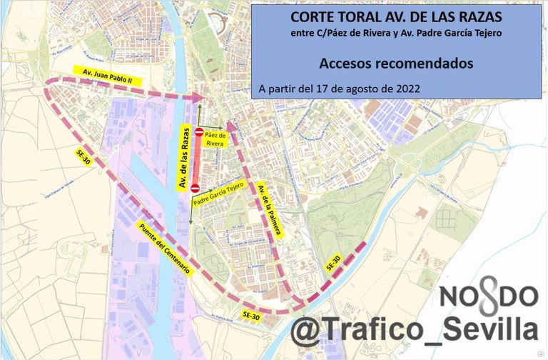En concreto, el plan de tráfico implica una reordenación de las vías aledañas a la Avenida de las Razas y el interior del barrio de Reina Mercedes para facilitar las distintas alternativas y los desvíos. Por un lado, el tráfico procedente del Puente de las Delicias y Glorieta de Moliní por Avenida de las Razas en sentido sur deberá desviarse hacia Páez de Rivera y Cardenal Ilundain como alternativa para acceder a la Avenida de la Palmera. Y, justo en el lado opuesto, los vehículos que proceden de la SE-30 cogerán sentido hacia la Palmera. Por su parte, la calle Padre García Tejero queda como acceso para los residentes al barrio. En consecuencia, los itinerarios alternativos para sortear las obras son a través de SE-30 hacia salida hacia la Avenida de la Palmera o SE-30 salida por la Avenida Juan Pablo II.