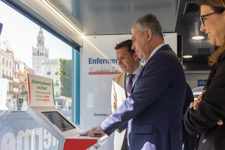 El alcalde de Sevilla, José Luis Sanz, ha visitado el tráiler de la Ruta Enfermera organizado por el Consejo General de Enfermería junto al Colegio de Enfermería de Sevilla ubicado en la plaza de San Francisco. Durante su visita, el primer edil ha conocido el vehículo en el que se imparten charlas, también se fomentan hábitos saludables y se realizan distintas pruebas diagnósticas a petición de los visitantes.