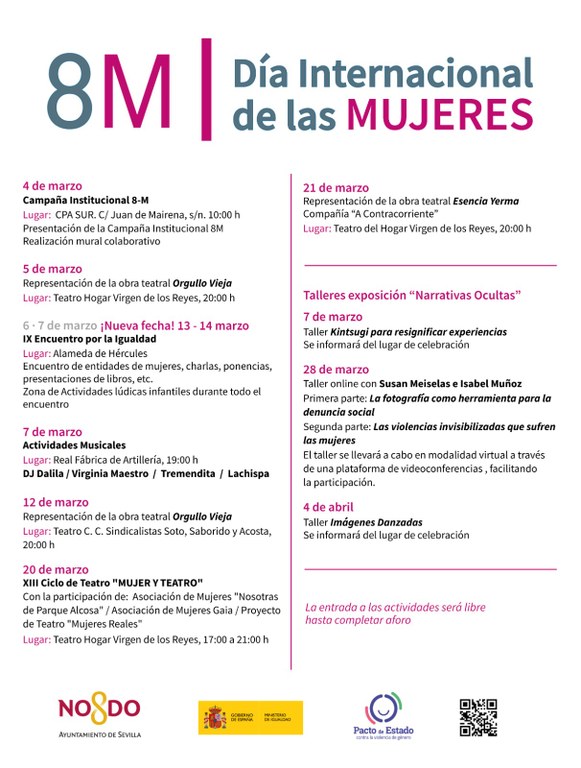 Uno de los eventos centrales de la programación será el IX Encuentro por la Igualdad, los días 13 y 14 de marzo en la Alameda de Hércules (previstos inicialmente los días 6 y 7 y pospuesto por las previsiones meteorológicas), donde se desarrollarán charlas, ponencias, presentaciones de libros y actividades lúdicas infantiles. La jornada del 7 de marzo concluirá con conciertos en la Real Fábrica de Artillería (inicialmente previstos en la Alameda de Hércules, pero trasladados por las previsiones meteorológicas), en el que participarán las artistas DJ Dalila, Virginia Maestro, Rosario la Tremendita y Lachispa.