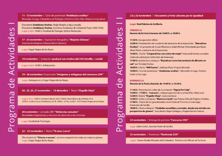Entre las propuestas, destacan el ciclo de ponencias Andaluzas ocultas, que se celebrará del 11 al 13 de noviembre en la Facultad de Filología; la exposición fotográfica Mujeres Gitanas, en el Hogar Virgen de los Reyes del 17 al 25 de noviembre, o la muestra Imágenes y eslóganes del concurso 25N en la Sala Antiquarium y en el Hogar Virgen de los Reyes, entre los días 19 y 26 de noviembre.