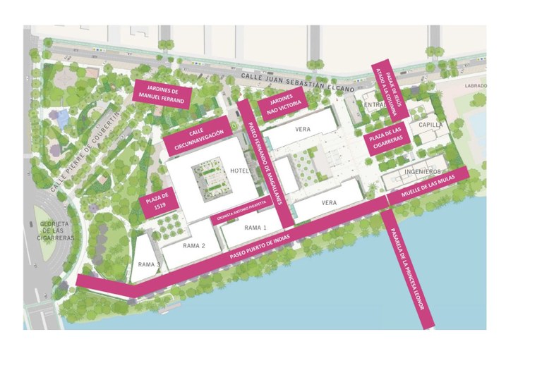 Las nuevas denominaciones serán: Paseo Puerto de Indias, Jardines Nao Victoria, Muelle de las Mulas, Paseo Fernando de Magallanes, Plaza de las Cigarreras, Pasaje de Jesús Atado a la Columna, calle Circunnavegación, Cronista Antonio Pigafetta y Plaza de 1519. A este conjunto se suman los Jardines de Manuel Ferrand, que recuperarán su delimitación original, abarcando todo el espacio ajardinado comprendido entre la avenida Juan Sebastián Elcano y la Glorieta de las Cigarreras.