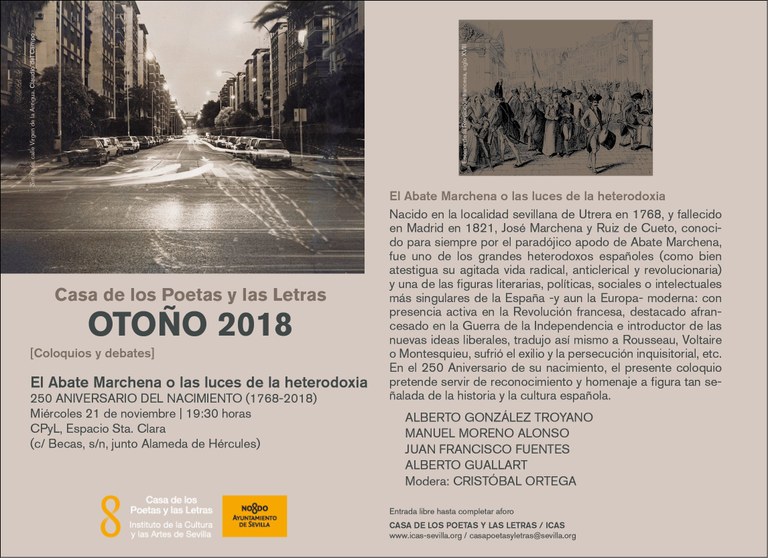 La Casa de los Poetas y las Letras-ICAS del Ayuntamiento de Sevilla acoge este miércoles 21 de noviembre a las 19.30 horas el coloquio El Abate Marchena o las luces de la heterodoxia, en el que historiadores, docentes y expertos en la figura y en la obra de este polifacético utrerano repasarán su trayectoria política, social e intelectual coincidiendo con el 250 aniversario de su nacimiento.
