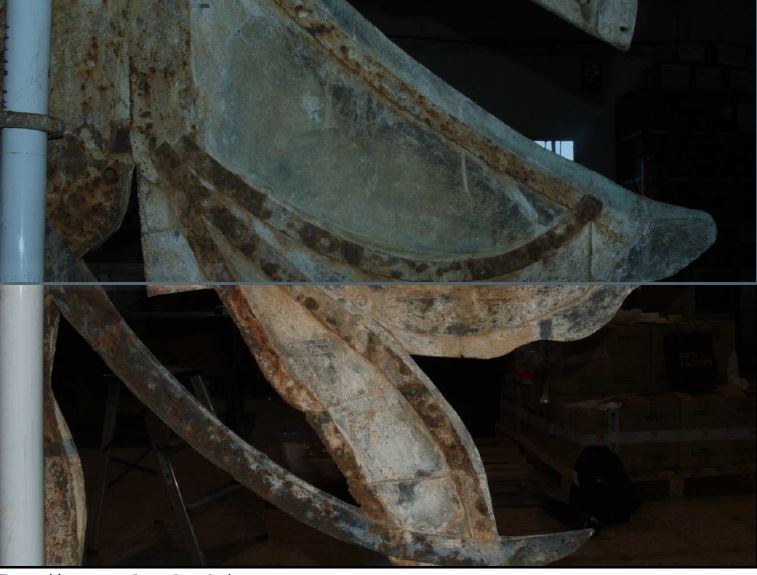 De cara a la consolidación estructural de este elemento, se sustituirán los remaches de hierro deteriorados y no originales por otros de cobre, de tamaño y forma similar a los que tuvo en origen. Asimismo, se añadirán los remaches de cobre faltantes, y se reforzarán las pletinas de hierro para garantizar su función de sustentación.