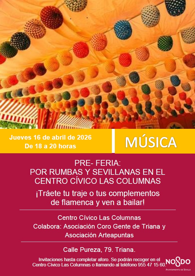 PRE-FERIA: "POR RUMBAS Y SEVILLANAS" https://www.sevilla.org/centros-civicos/casa-de-las-columnas/eventos/pre-feria-por-rumbas-y-sevillanas PRE-FERIA: "POR RUMBAS Y SEVILLANAS" 2026-04-16T18:00:00+02:00 2026-04-16T20:00:00+02:00 Ver todo CC Casa de Las Columnas Detalles del evento Qué Centro Cívico Casa de las Columnas Cuándo 16/04/2026 de 18:00 a 20:00 Dónde CC Casa de Las Columnas Agregar evento al calendario iCal Acciones de documento Imprimir Enviar Compartir Compartir en facebook Compartir en twitter Compartir en linkedin Compartir en whatsapp