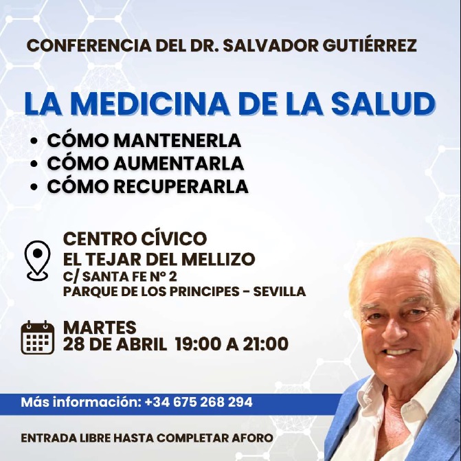 LA MEDICINA DE LA SALUD https://www.sevilla.org/centros-civicos/el-tejar-del-mellizo/eventos/la-medicina-de-la-salud LA MEDICINA DE LA SALUD 2026-04-28T19:00:00+02:00 2026-04-28T21:00:00+02:00 Conferencia del Dr. Salvador Gutiérrez Conferencia del Dr. Salvador Gutiérrez Ver todo Centro Cívico Tejar del Mellizo Detalles del evento Qué Centro Cívico El Tejar del Mellizo Cuándo 28/04/2026 de 19:00 a 21:00 Dónde Centro Cívico Tejar del Mellizo Agregar evento al calendario iCal Acciones de documento Imprimir Enviar Compartir Compartir en facebook Compartir en twitter Compartir en linkedin Compartir en whatsapp
