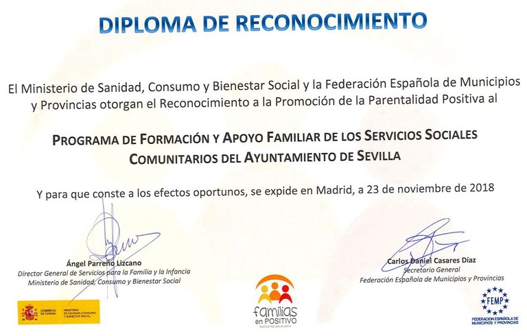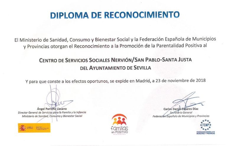 La Plataforma “Familias en Positivo”, impulsada por la Federación Española de Municipios y Provincias y el Ministerio de Salud, Consumo y Bienestar Social, a través de su Comité Evaluador de Buenas Prácticas en la Parentalidad Positiva, ha concedido el Reconocimiento a la Promoción de la Parentalidad Positiva a los Centros de Servicios Sociales de “Nervión “/ “San Pablo- Santa Justa” y al “Programa de Formación y Apoyo Familiar” del Ayuntamiento de Sevilla, pertenecientes al Servicio de Intervención de los Servicios Sociales. Dirección General de Acción Social. Delegación de Bienestar Social y Empleo.